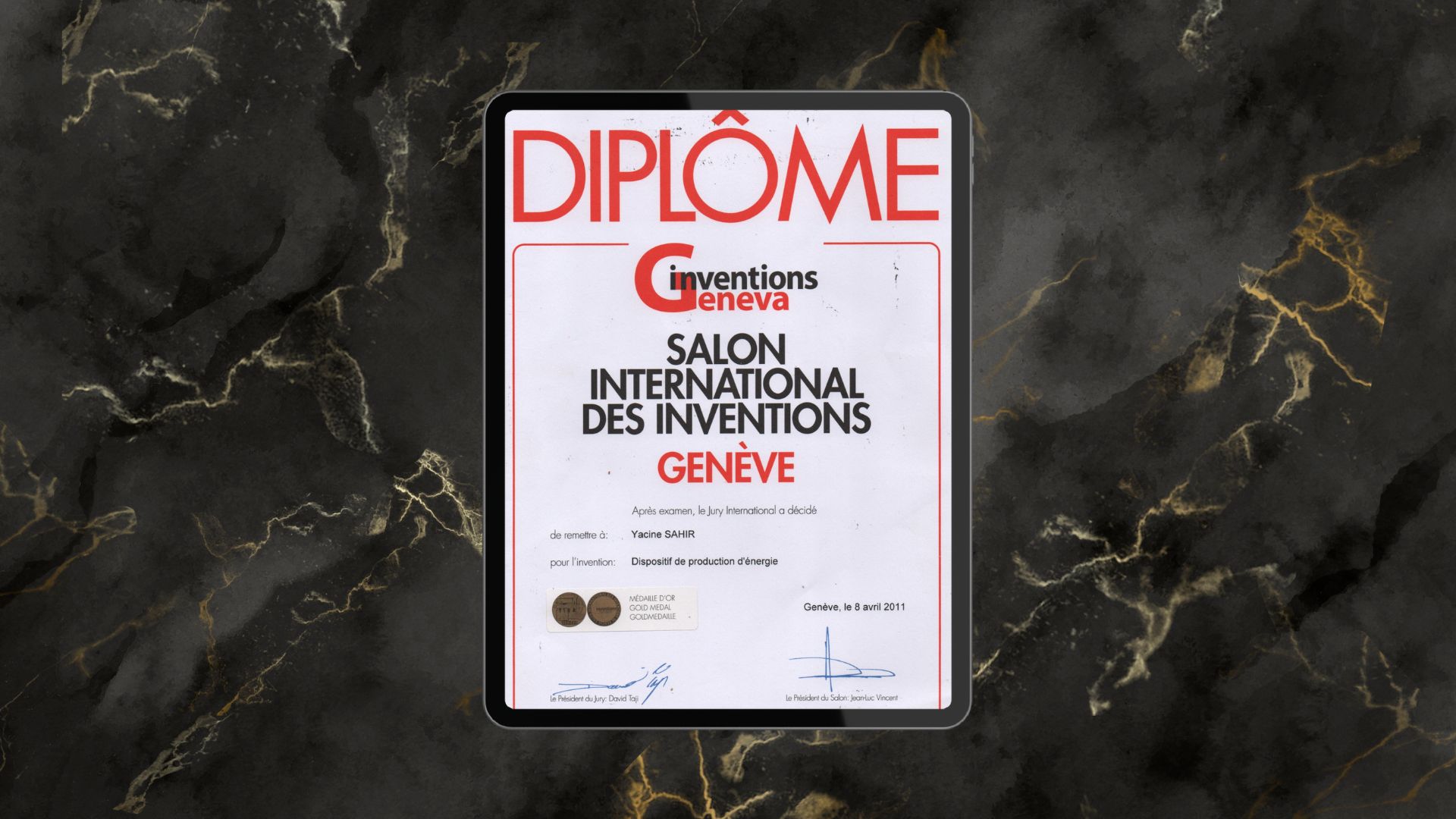 Diplôme Médaille d'Or Salon International des Inventions Genève 2011 (Dispositif de production d'énergie)